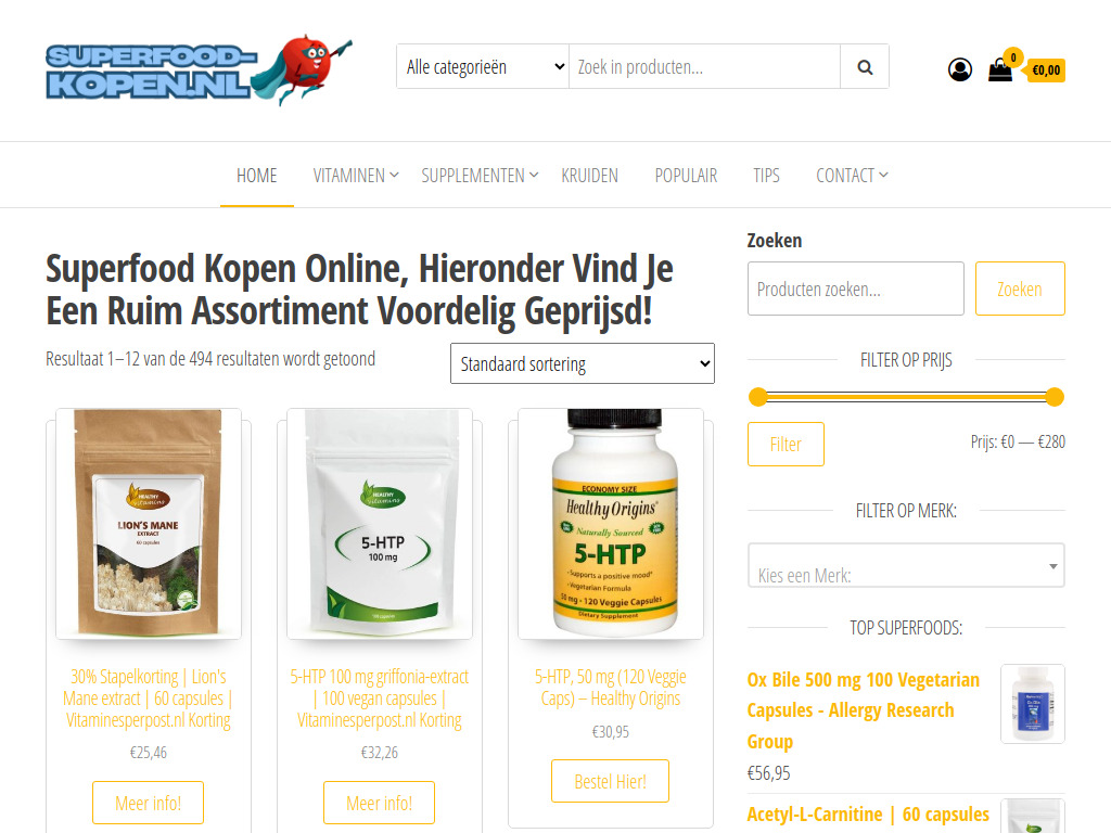 Op www.superfood-kopen.nl hebben wij regelmatig veel aanbiedingen op het gebied van superfoor, voedingssupplementen vitaminen en mineralen. Nergens anders zul je deze producten goedkoper vinden dan bop www.superfood-kopen.nl